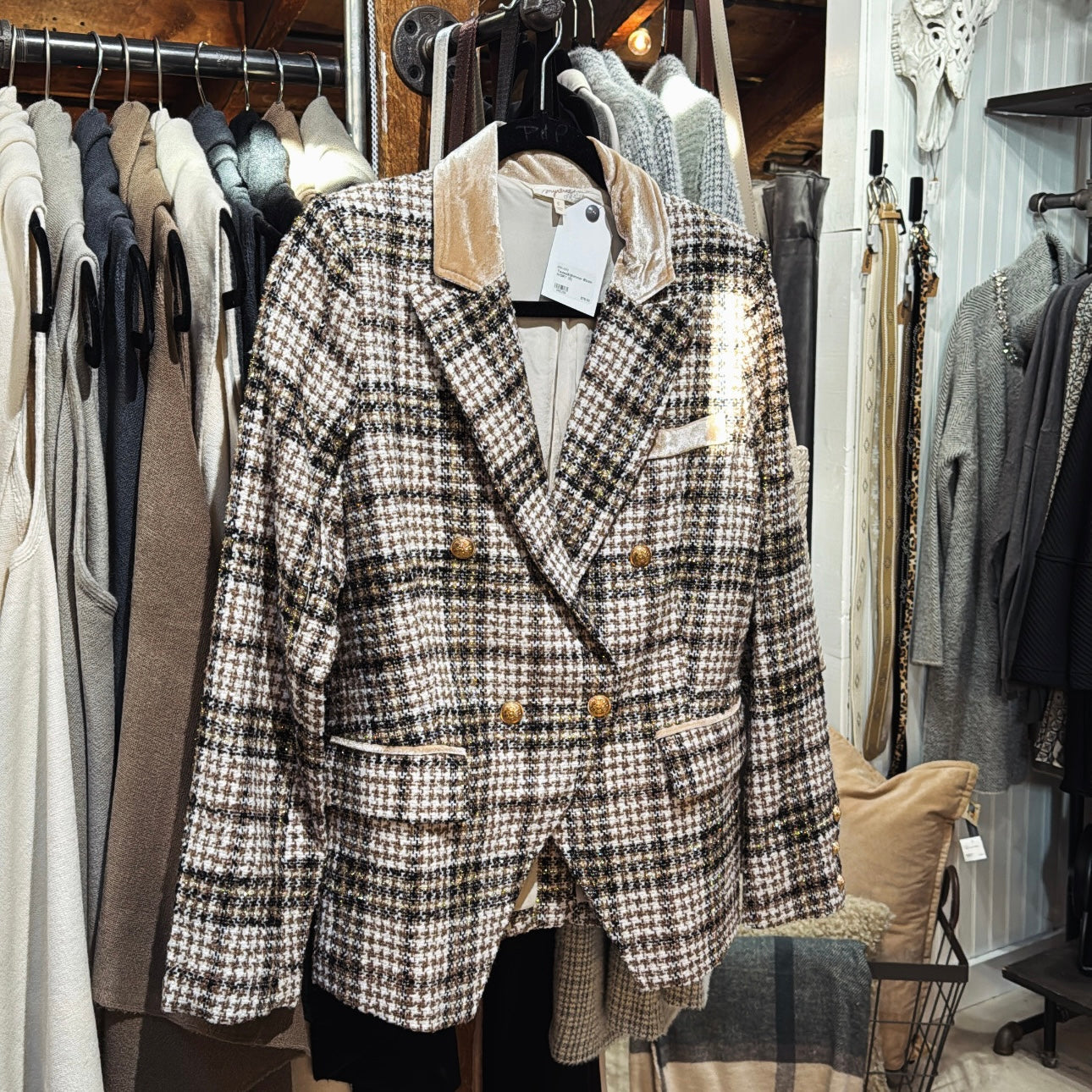 Luxe, tweed blazer with shimmer and velvet details. Lined.