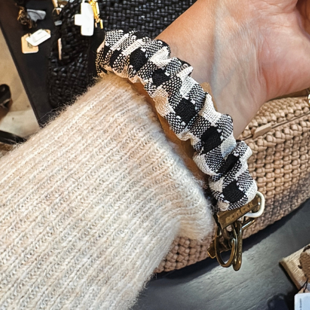 Woven crossbody purse with magnetic closure and removable strap.