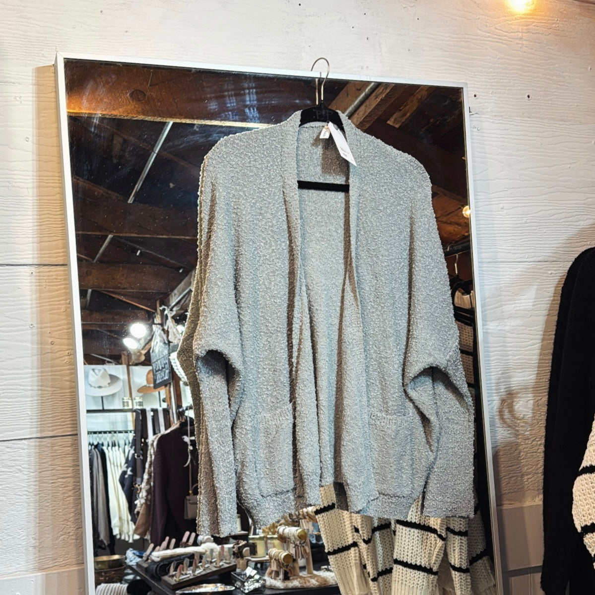 Luxe, medium weight boucle textured open cardigan.