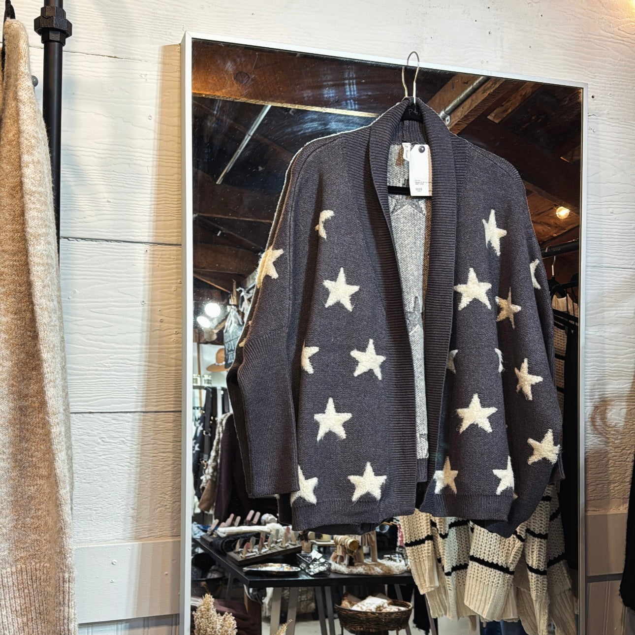 Cozy, star embroidered dolman sleeve cardigan.